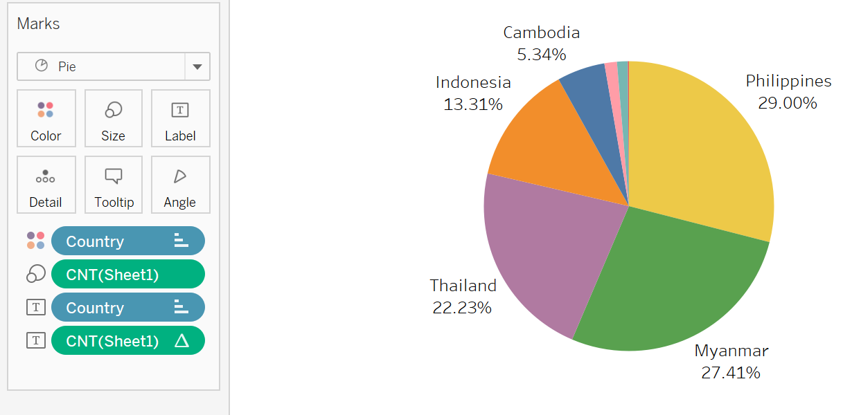 Pie Chart will be displayed, right click Angle CNT(Sheet1), quick table calculation to Percent of Total.