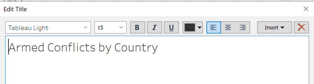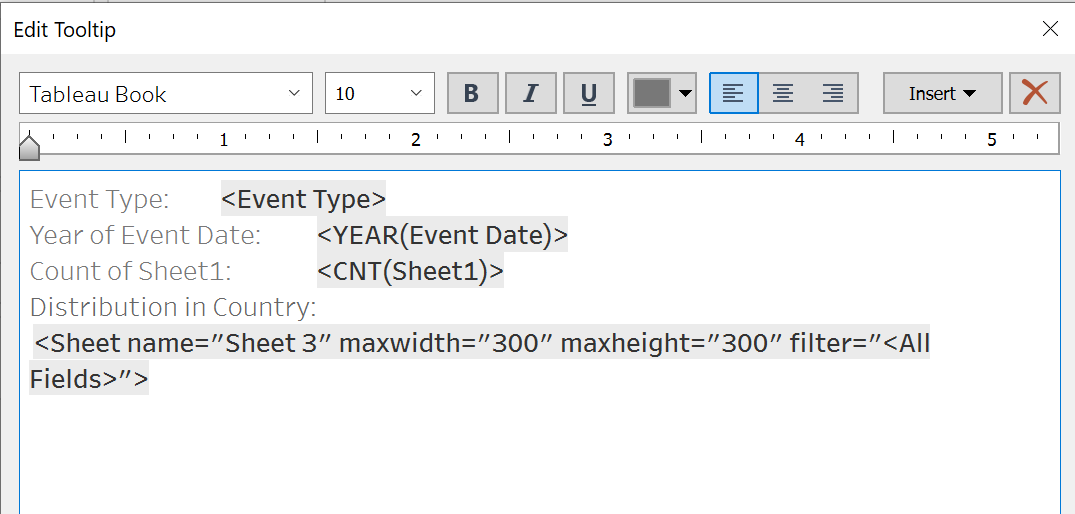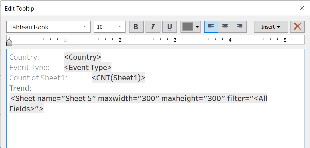 - Back to the Conflict by Country graph and click on the Tooltip and insert the Line Graph generated.
