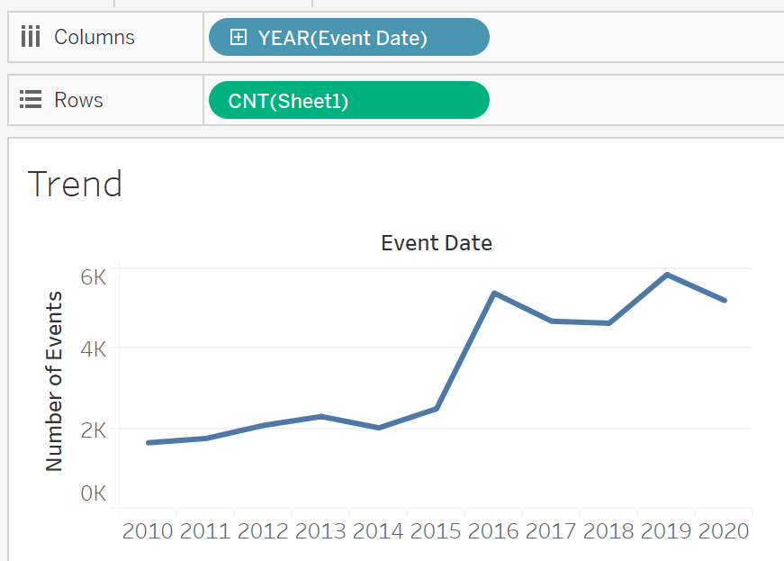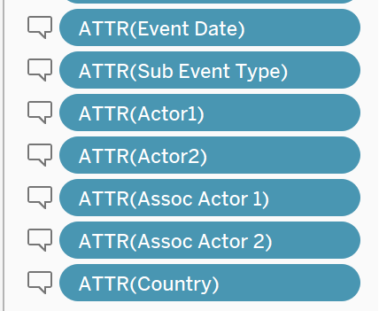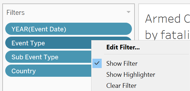 - Drag YEAR, Event Type, Sub Event Type and Country to filter and right click to enable Show Filter.