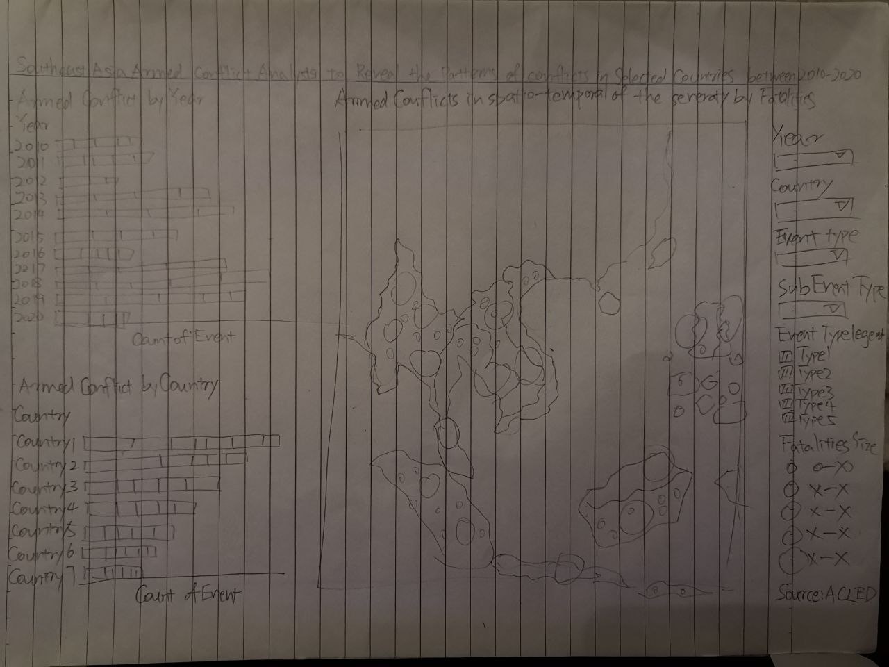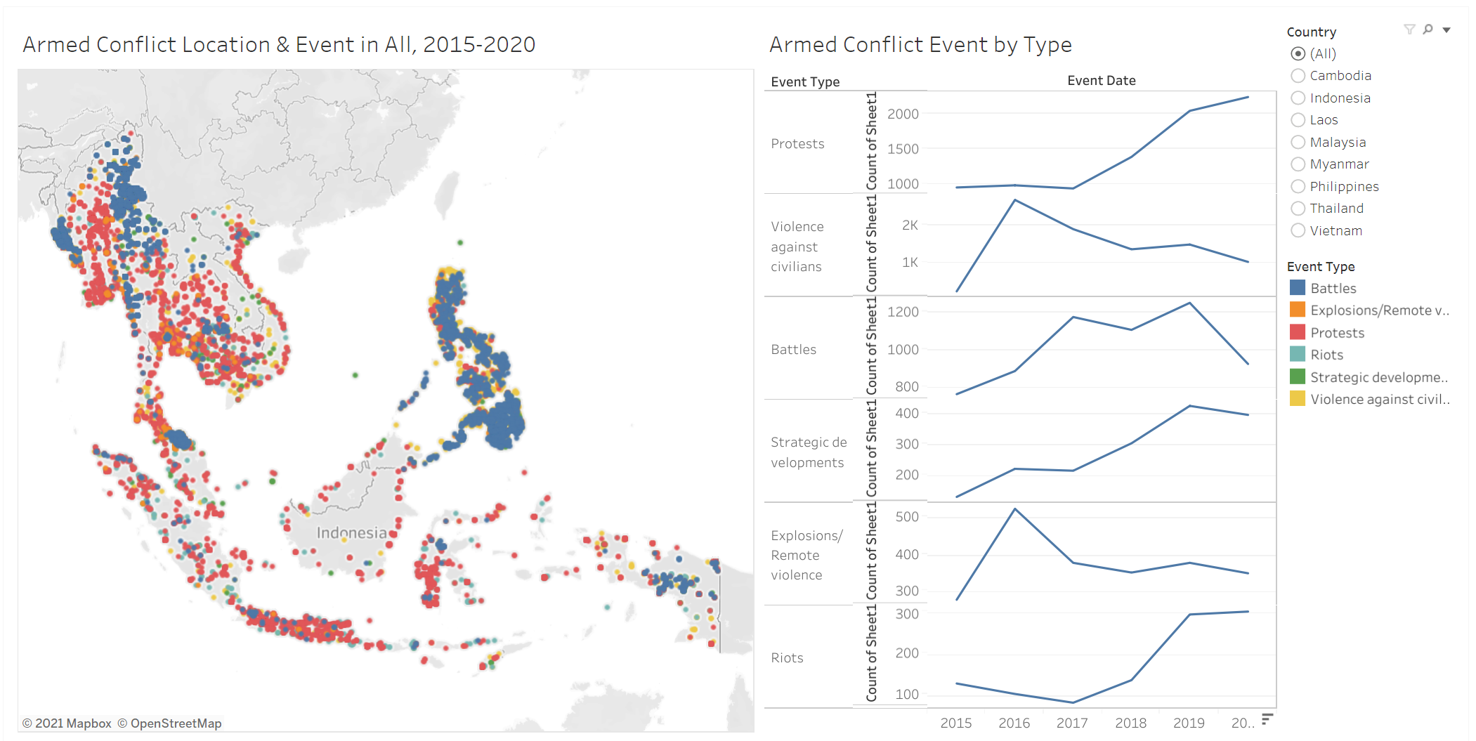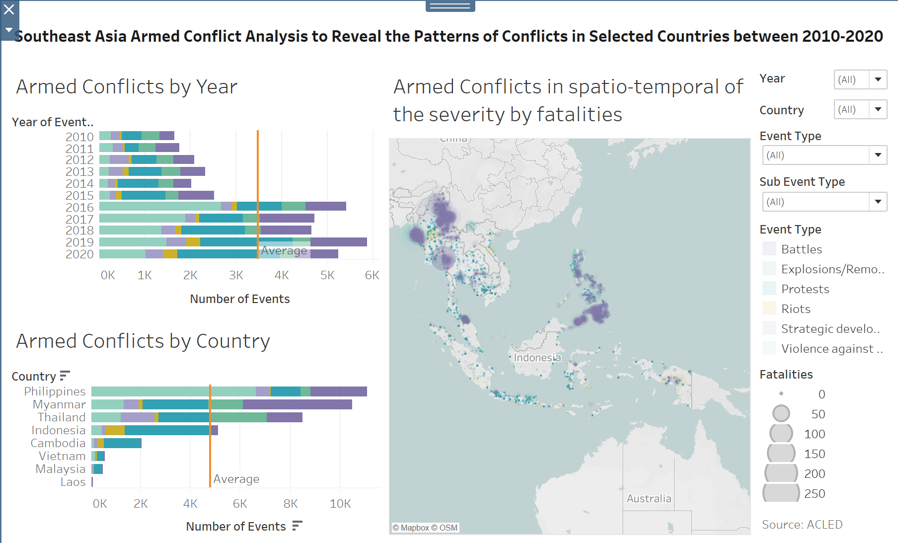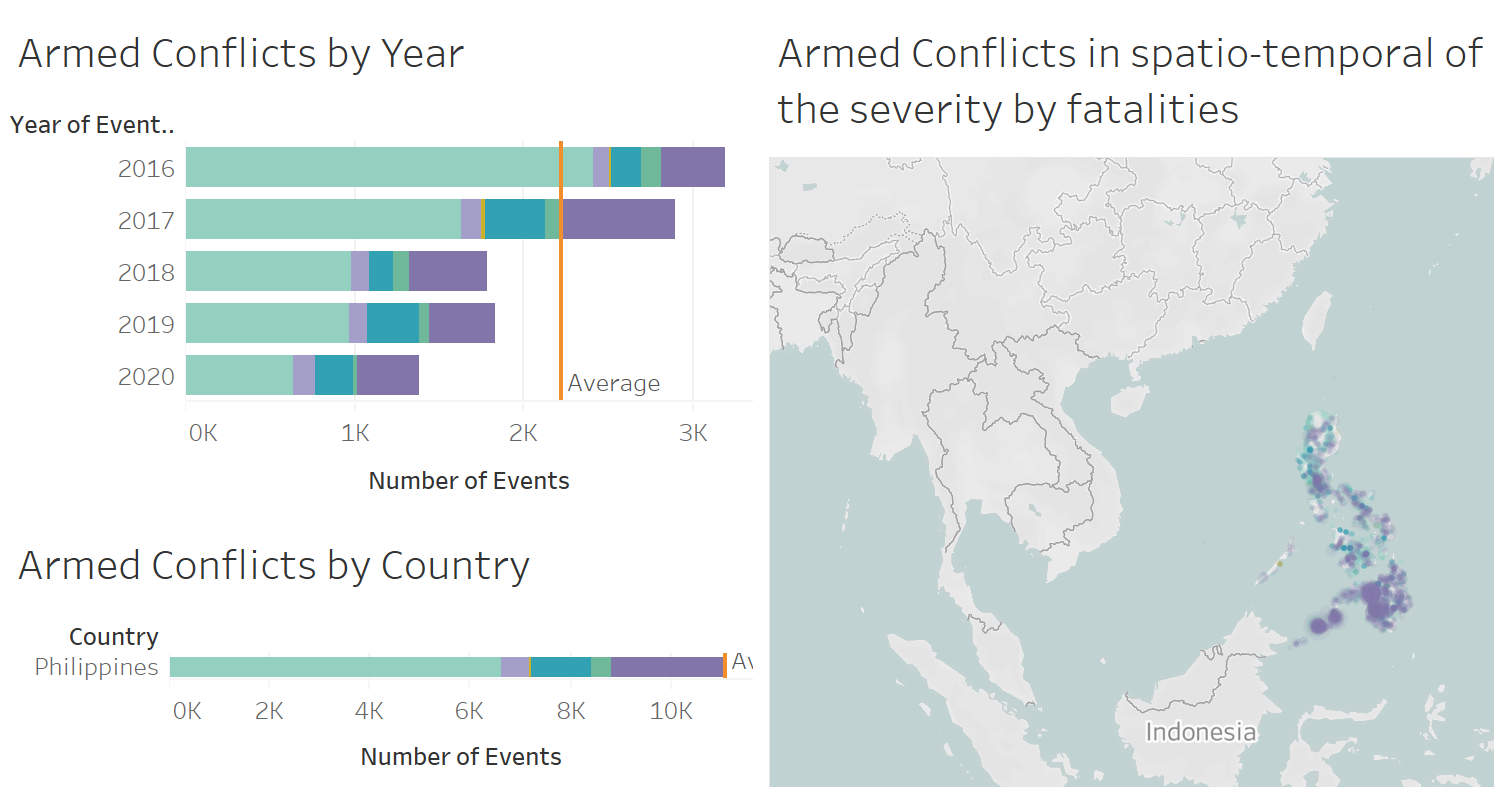 Please see the graph and critiques from clarity, aesthetics and interactivity aspects below. The link of the original dashboard can be found here https://public.tableau.com/profile/tskam#!/vizhome/South-eastAsiaArmedConflictAnalysis/South-eastAsiaArmedConflictAnalysis