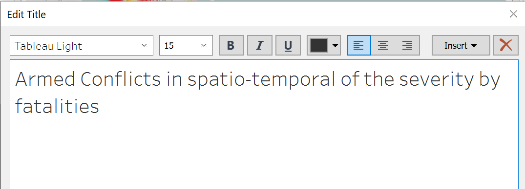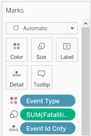 - Drag Event Type to Color, Fatalities to Size, Event Id Cnty to Detail.