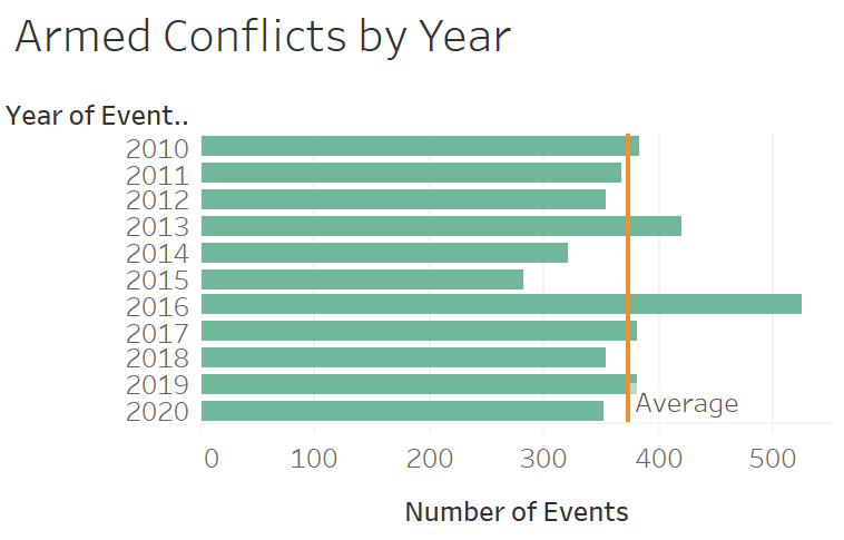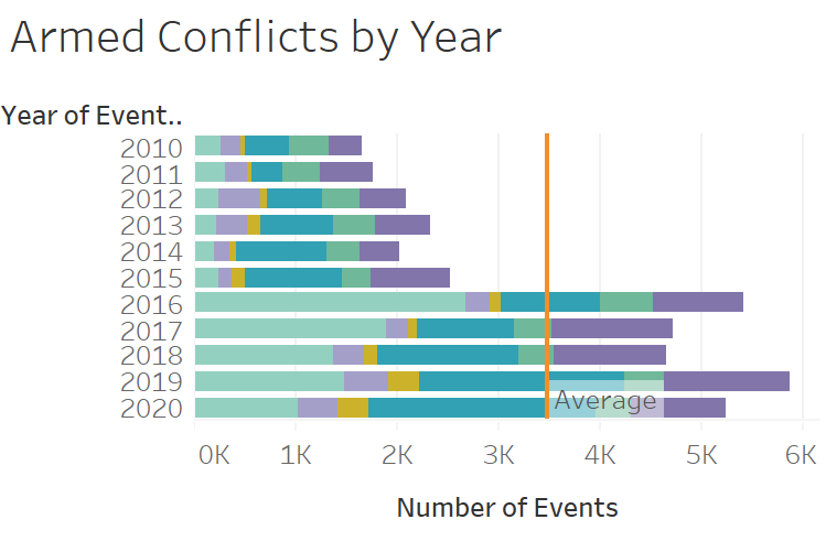 - Over the years, the number of armed conflicts keeps increasing in the Southeast Asia. The number of events almost doubled after year 2015 and keep as high. It’s higher than the average after year 2015.