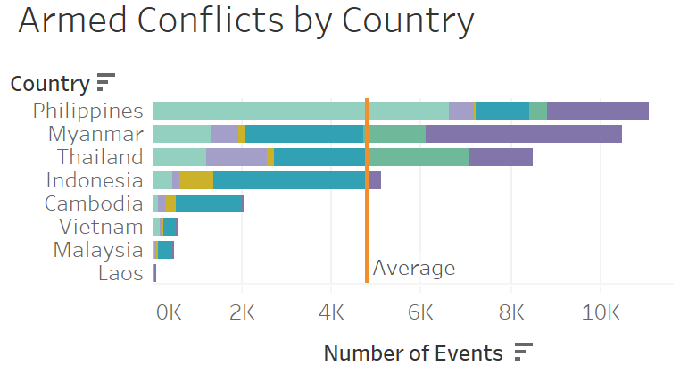 - Philippines has the most number of conflicts and then followed by Myanmar. Thailand and Indonesia also has more than the average.